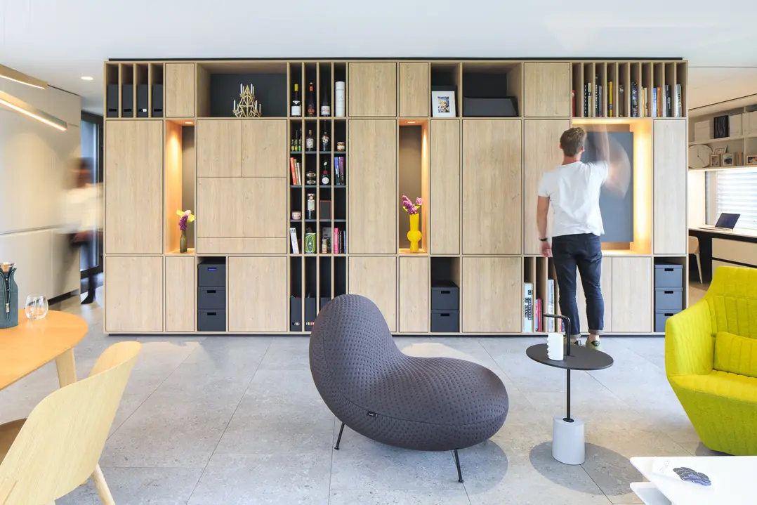 Au cœur de cet agencement, le meuble de séparation entre l’entrée et le salon joue un rôle central. Conçu en mélaminé décor chêne, ce meuble offre une solution à la fois esthétique et pratique pour structurer l’espace. Côté salon, il comporte des niches décoratives et des espaces de rangement pour un accès pratique aux objets du quotidien, tout en ajoutant une touche décorative.