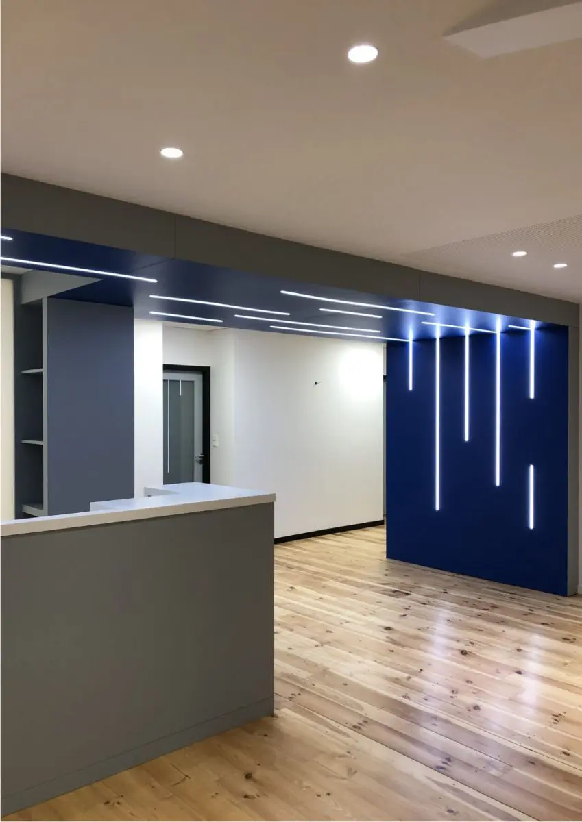 Pour ce projet, nous avons conçu un espace d’accueil sur mesure pour une industrie, comprenant une banque d’accueil élégante, un faux plafond avec éclairage LED intégré et la pose d’un parquet massif. Ce projet visait à transformer l’accueil en un espace à la fois professionnel et accueillant, en mettant l’accent sur des matériaux durables et un design moderne.