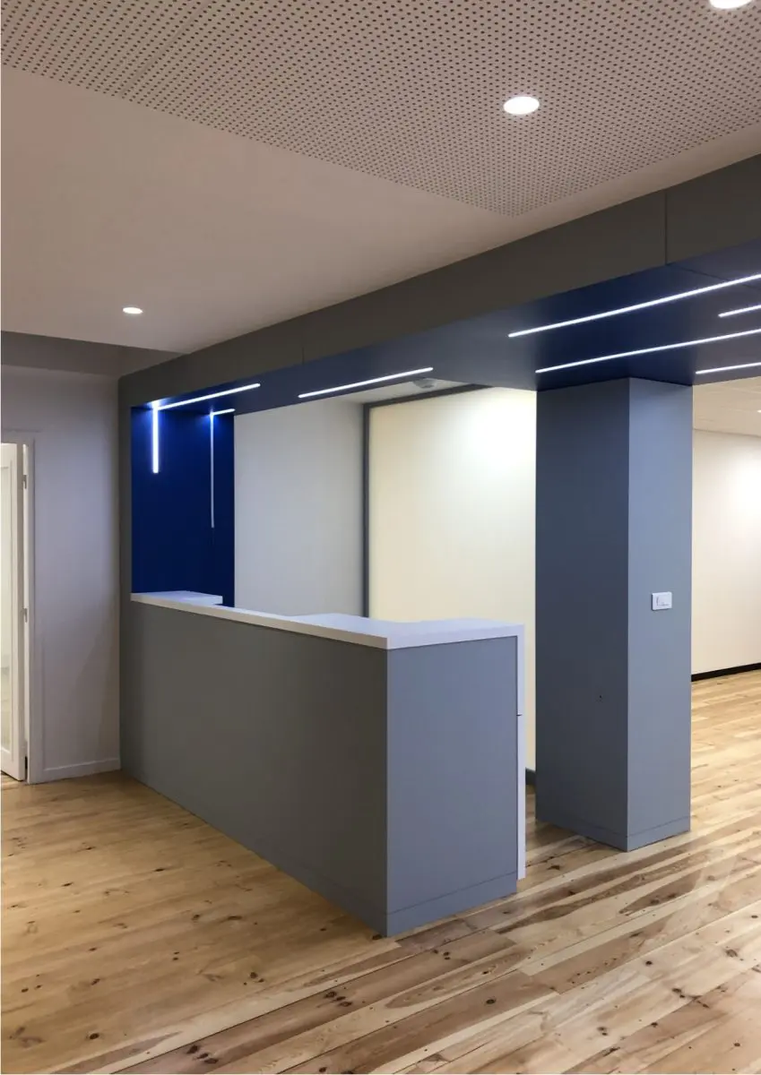 Pour compléter l’aménagement de l’accueil, nous avons installé un faux plafond avec éclairage LED intégré. Ce plafond lumineux offre une ambiance professionnelle et agréable, tout en garantissant un éclairage optimal pour l’espace de réception. Les LEDs, encastrées dans des panneaux en médium peint, créent une lumière homogène et diffuse, apportant un confort visuel idéal pour les visiteurs et le personnel.