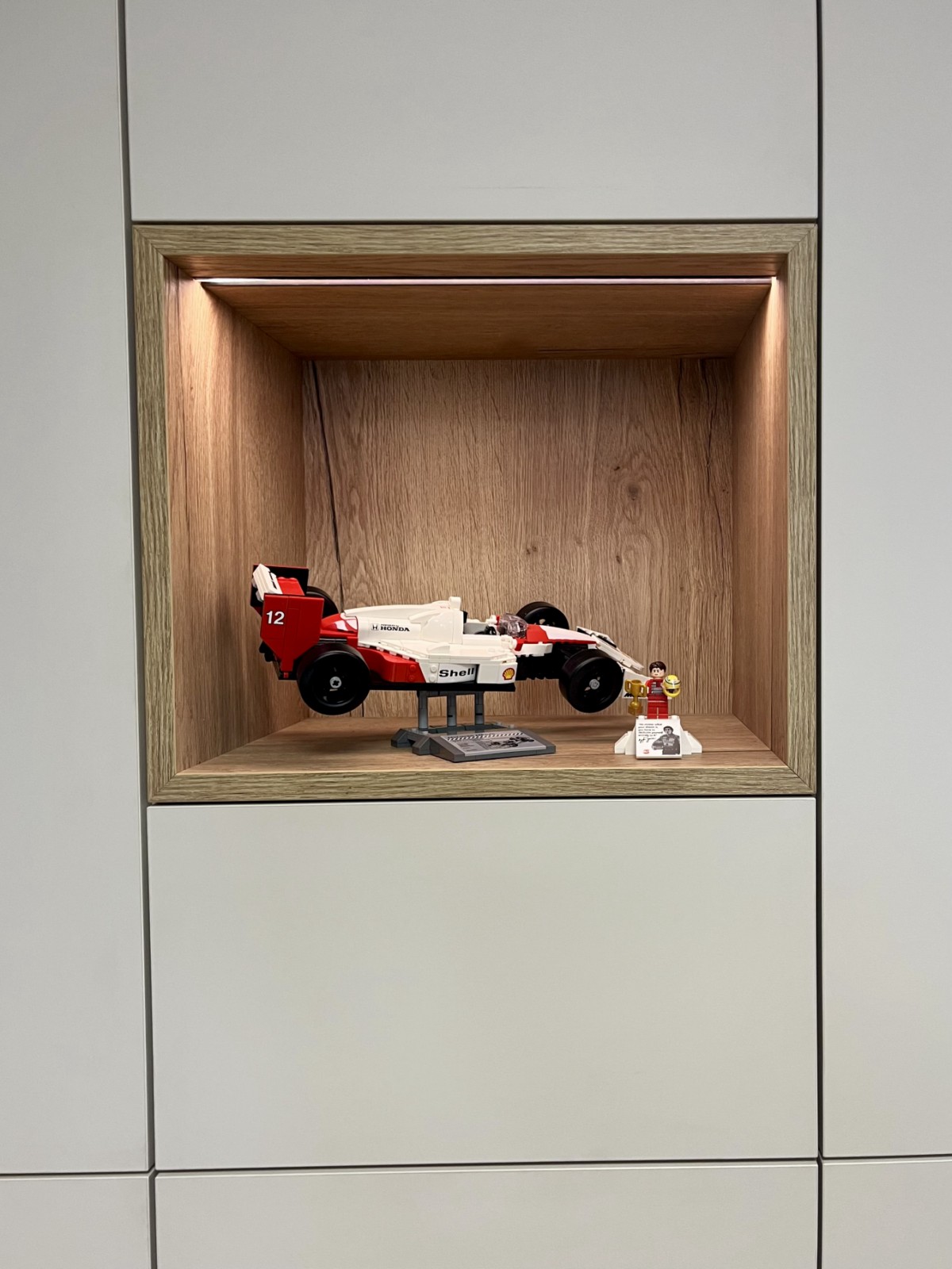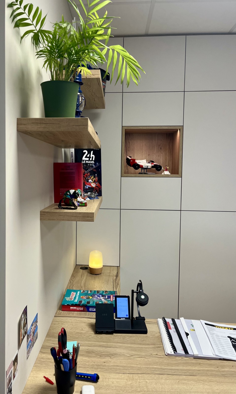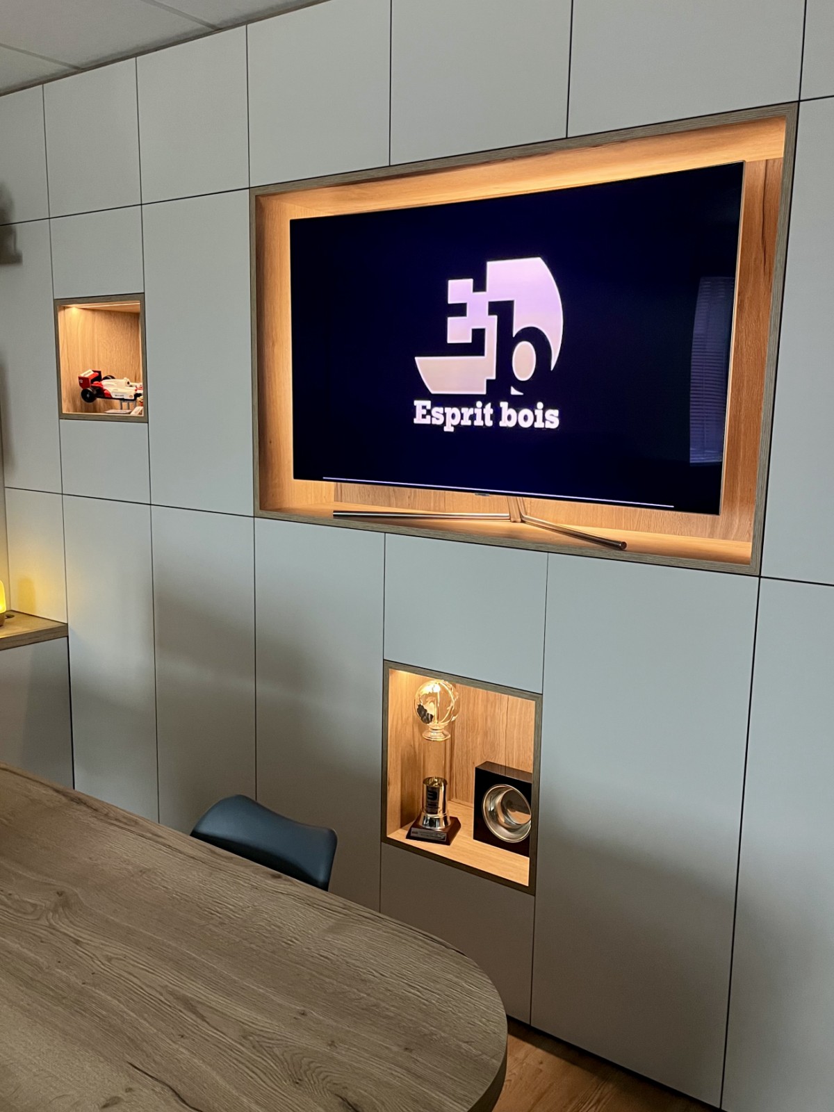 Chaque niche a été mise en valeur par un bandeau LED discret : un éclairage pensé pour révéler les objets exposés, mais aussi pour donner une profondeur et une ambiance chaleureuse à la pièce. Certaines accueillent des trophées, d’autres des objets décoratifs ou des pièces de collection, créant ainsi un espace personnalisé qui raconte l’histoire de ceux qui y travaillent.
