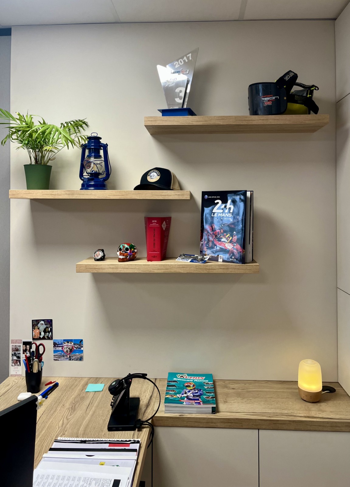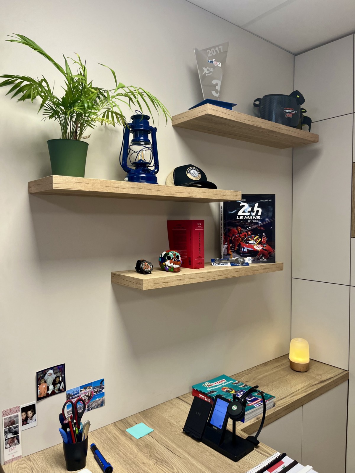 Sur un autre pan de mur, des étagères suspendues en mélaminé chêne viennent compléter l’aménagement. Elles reprennent le même esprit que le plateau du bureau et les niches, assurant une continuité visuelle harmonieuse. Positionnées à hauteur idéale, elles permettent de disposer plantes, livres ou objets symboliques qui donnent vie au bureau et le rendent unique.
