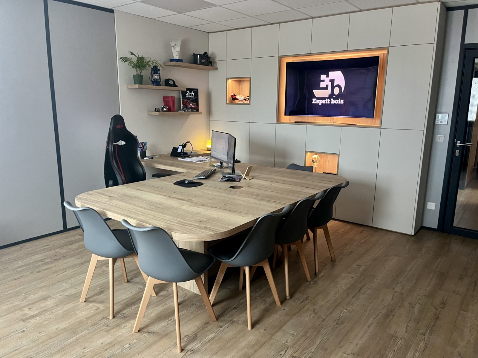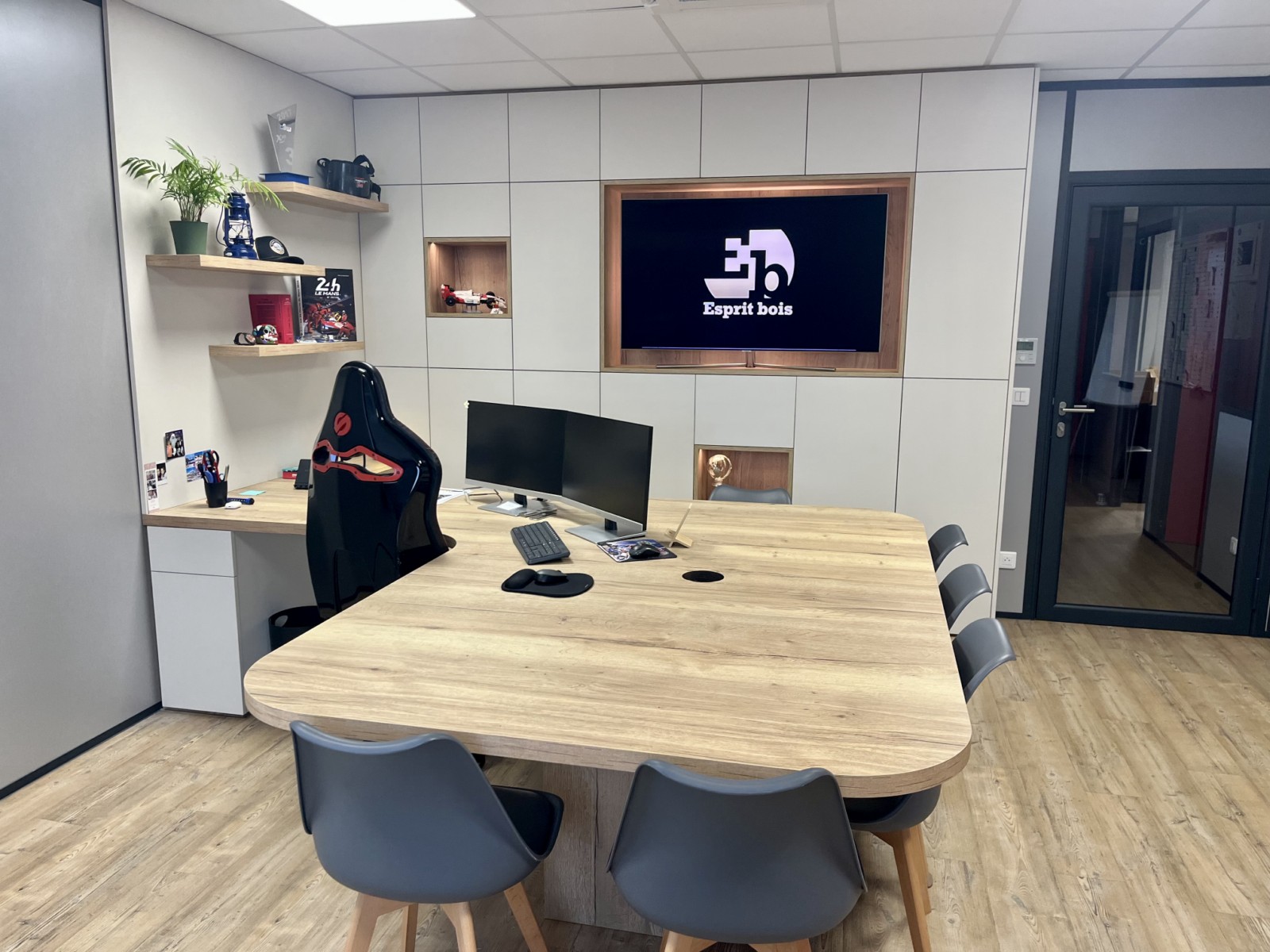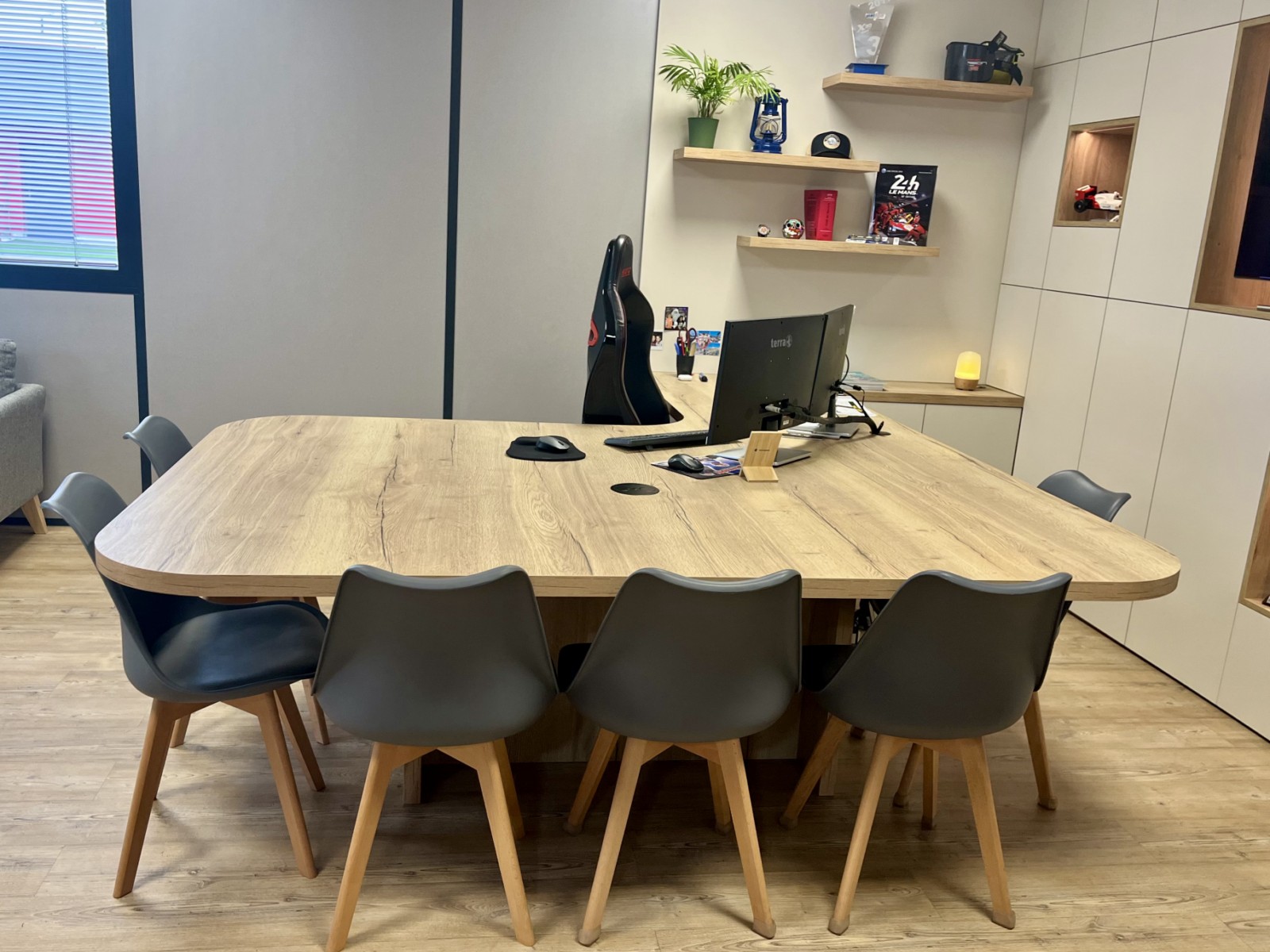 Le cœur de cet aménagement est un grand plateau en mélaminé chêne, dont le veinage naturel apporte une touche conviviale et authentique à l’espace. Sa générosité en surface permet de travailler confortablement, que ce soit seul ou en équipe. Détail important : une prise a été intégrée directement au plateau, pour que l’utilisation des équipements informatiques et multimédias reste simple et sans encombrement de câbles. Ce choix illustre bien notre volonté de marier design et usage concret.