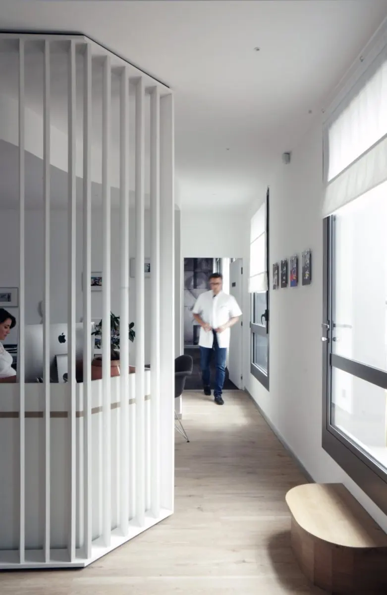 Le claustra vitré conçu pour la salle d’attente assure une séparation élégante et discrète, permettant de délimiter les espaces tout en favorisant la circulation de la lumière naturelle. Cette cloison vitrée crée une ambiance apaisante et lumineuse pour les patients en salle d’attente, tout en conservant une certaine intimité. Le choix du verre et de lignes épurées donne au claustra un aspect moderne et accueillant, idéal pour un cabinet de chirurgie esthétique.