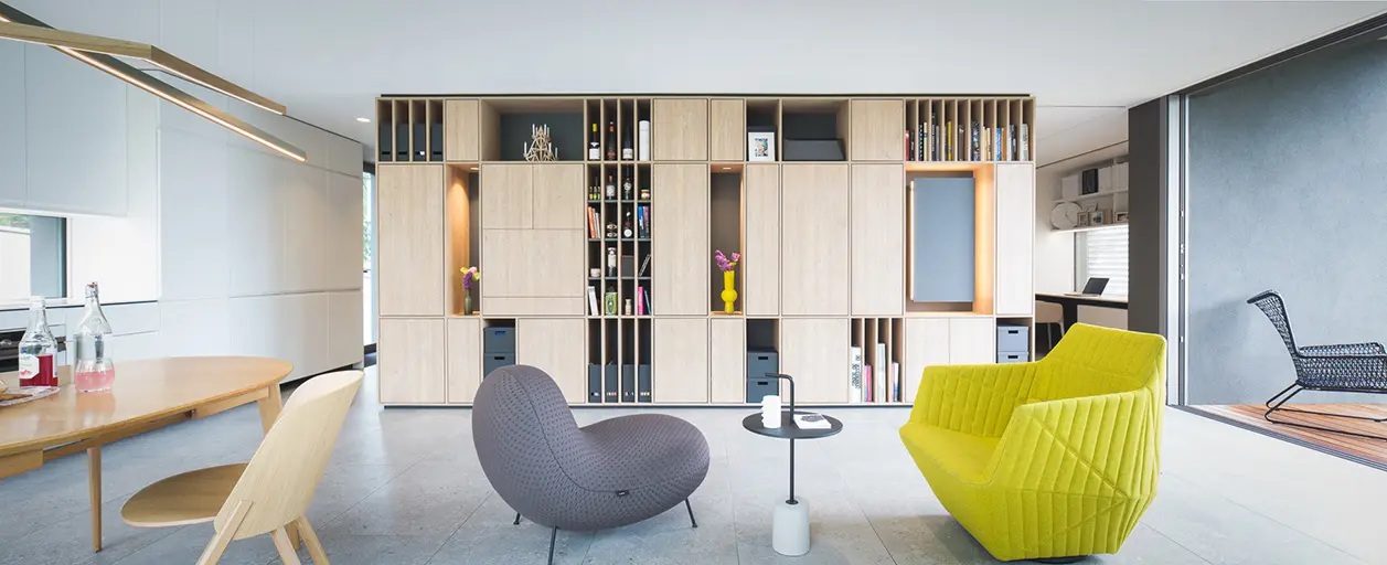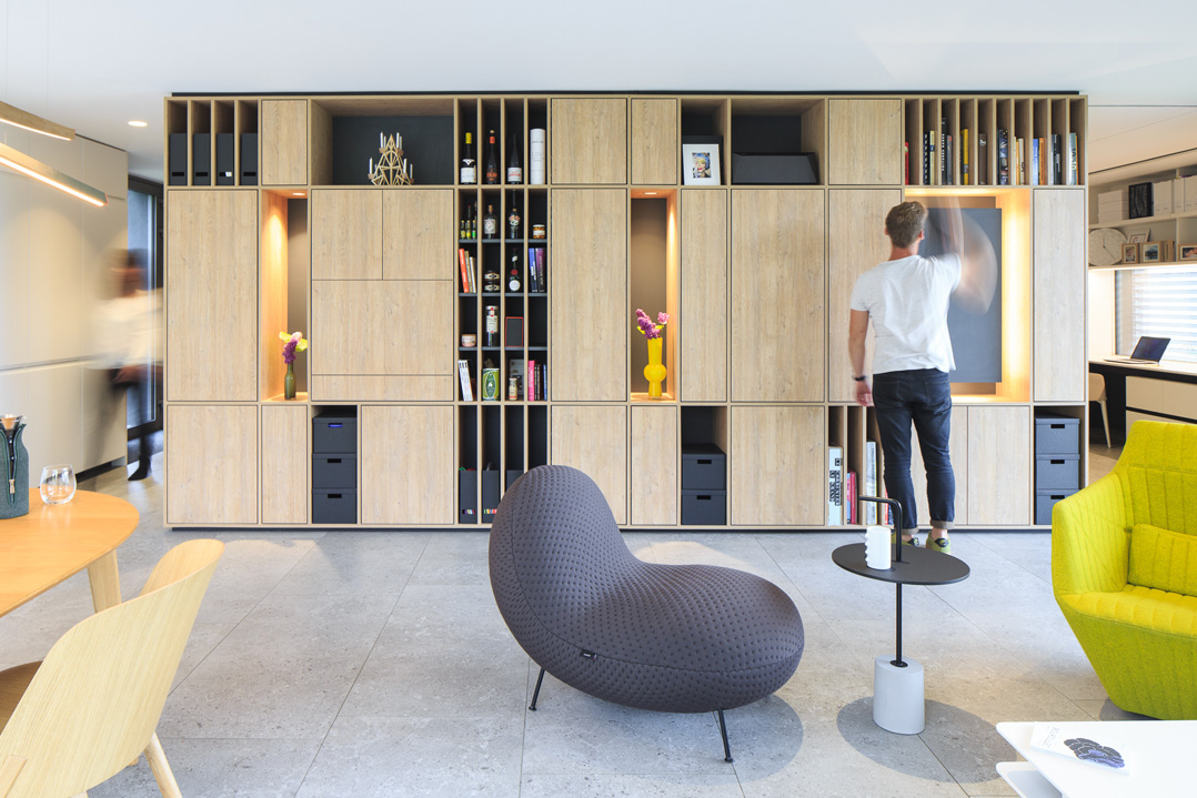 Chaque zone a été imaginée pour répondre à un usage précis. Les rangements fermés permettent de dissimuler les objets du quotidien, préservant la pureté des lignes. Les niches ouvertes, elles, accueillent aussi bien les livres que les objets décoratifs, et offrent une respiration visuelle qui dynamise l’ensemble. Deux modules verticaux sont mis en valeur par un éclairage intégré : la lumière souligne la profondeur, valorise les volumes et crée une atmosphère intime, idéale pour profiter du salon à tout moment de la journée.