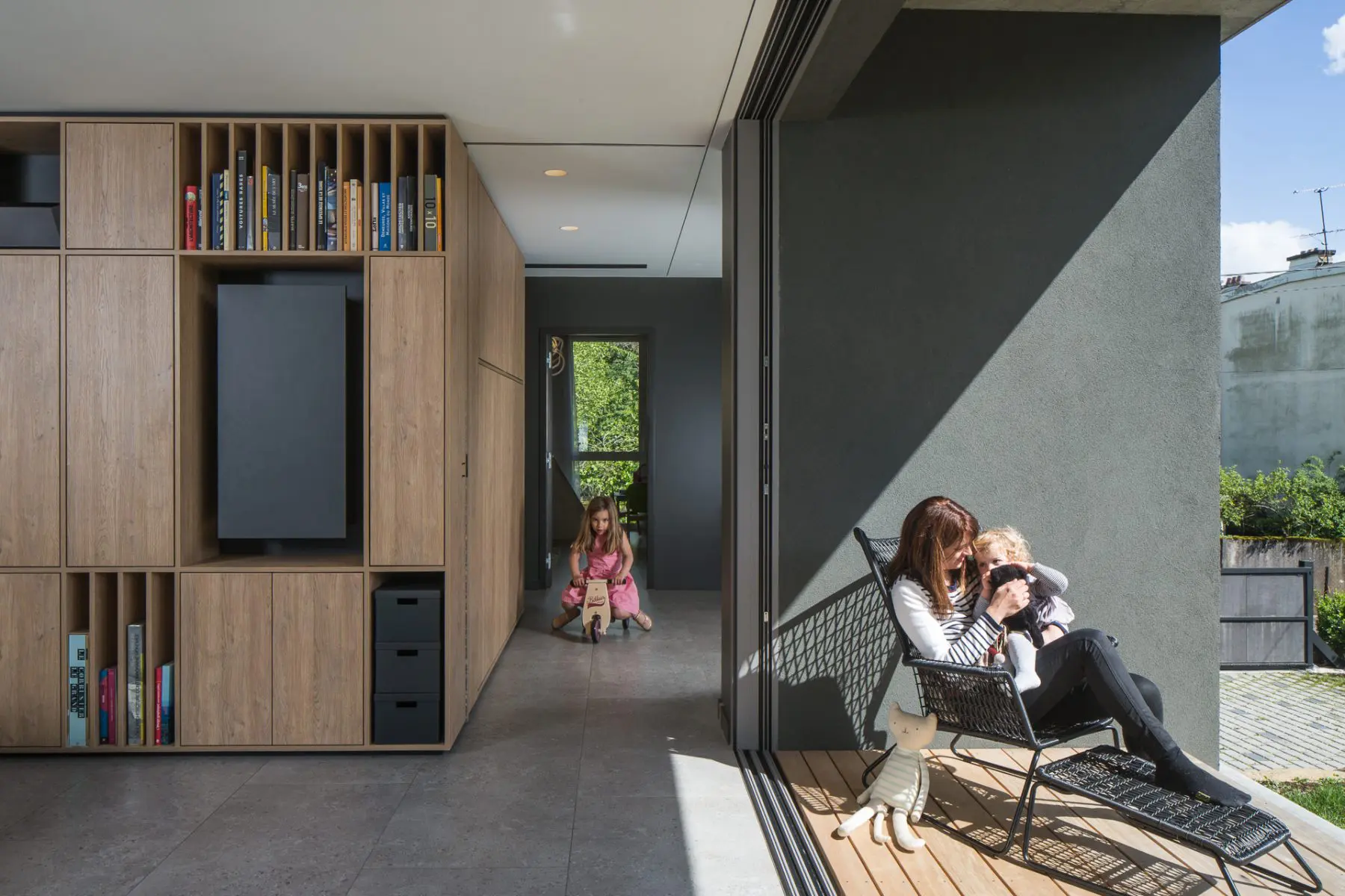 L’ouvrage occupe tout un pan de mur, donnant immédiatement une identité forte à la pièce. Le bois clair choisi pour les façades apporte une touche chaleureuse, tandis que les incrustations noires structurent l’ensemble avec élégance. Cet équilibre subtil entre naturel et contemporain donne à la bibliothèque une présence à la fois discrète et affirmée.