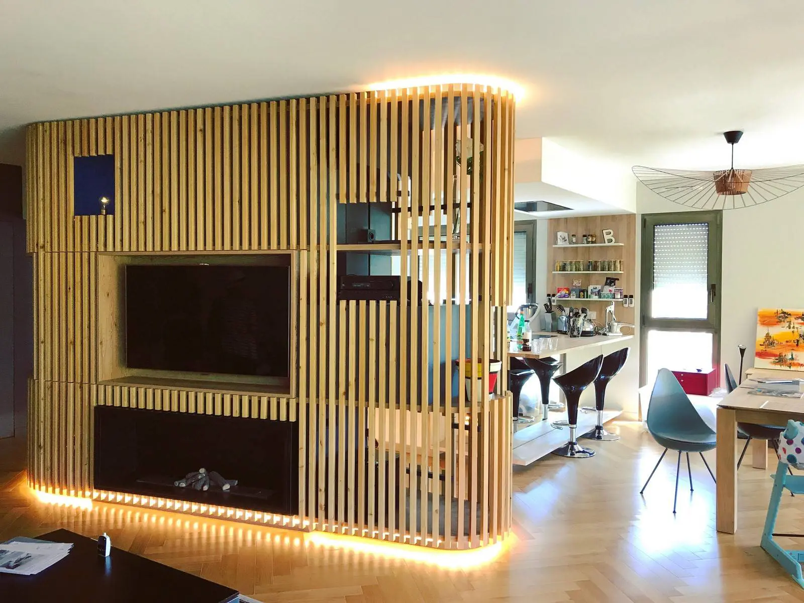 Meuble de salon sur mesure avec cheminée éthanol intégrée et niche TV réalisé par Esprit Bois à Annecy - ébénisterie mélaminé et tasseaux mélèze