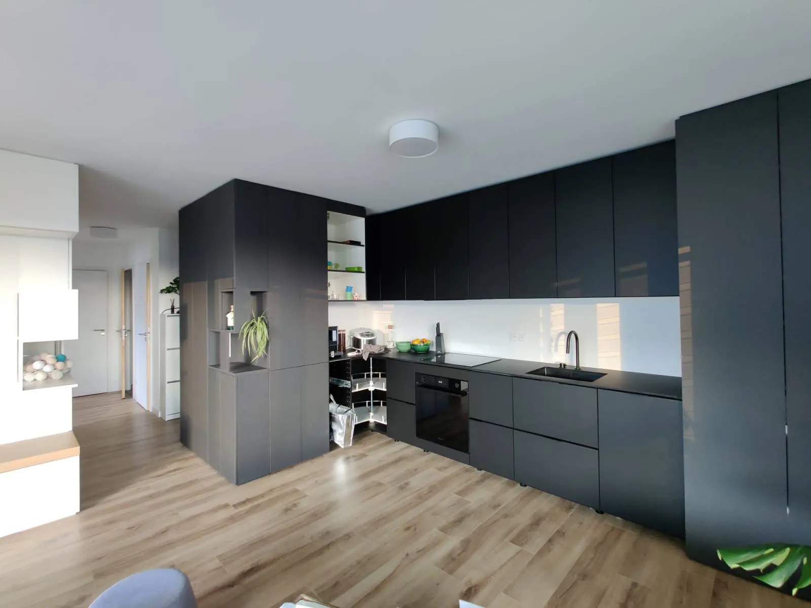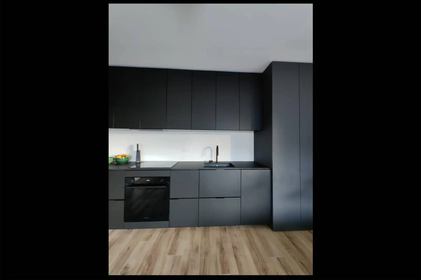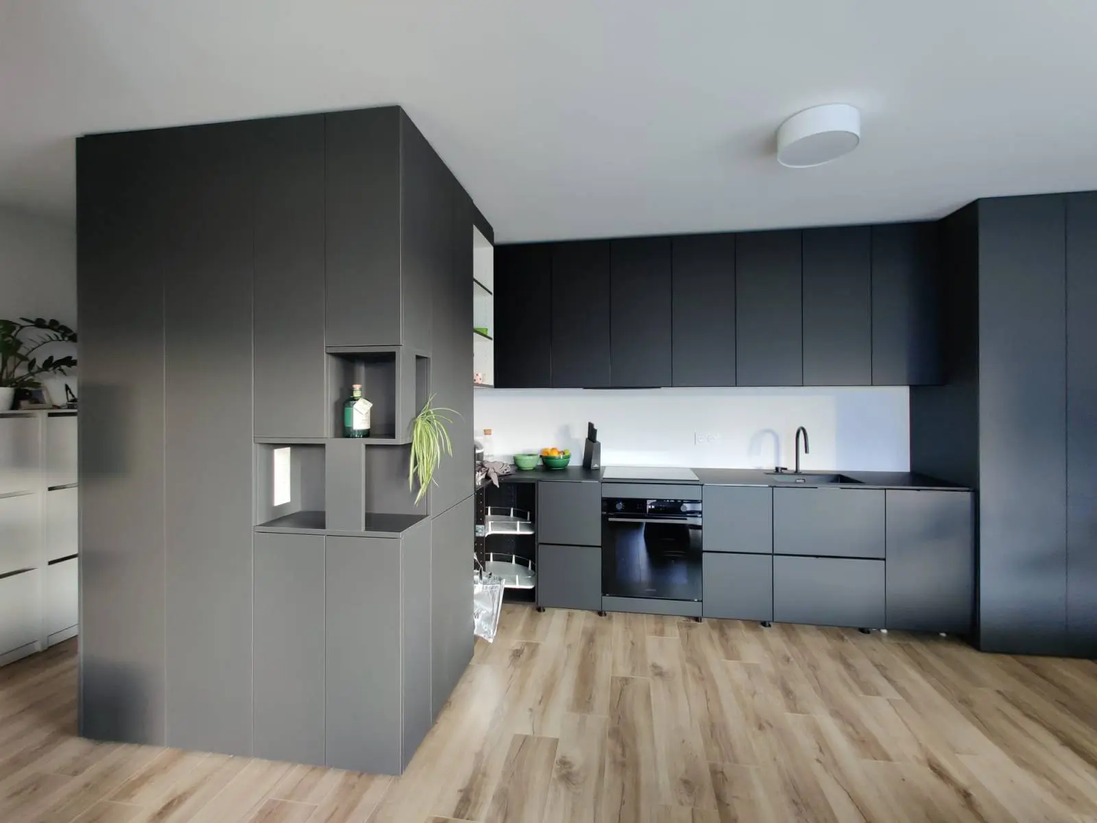 L’ensemble de cette cuisine sur mesure est composé de panneaux en mélaminé PerfectSense de couleur anthracite. Ce matériau de qualité supérieure offre une résistance exceptionnelle aux rayures, à l’usure et aux traces de doigts, tout en conservant un aspect mat élégant et contemporain.