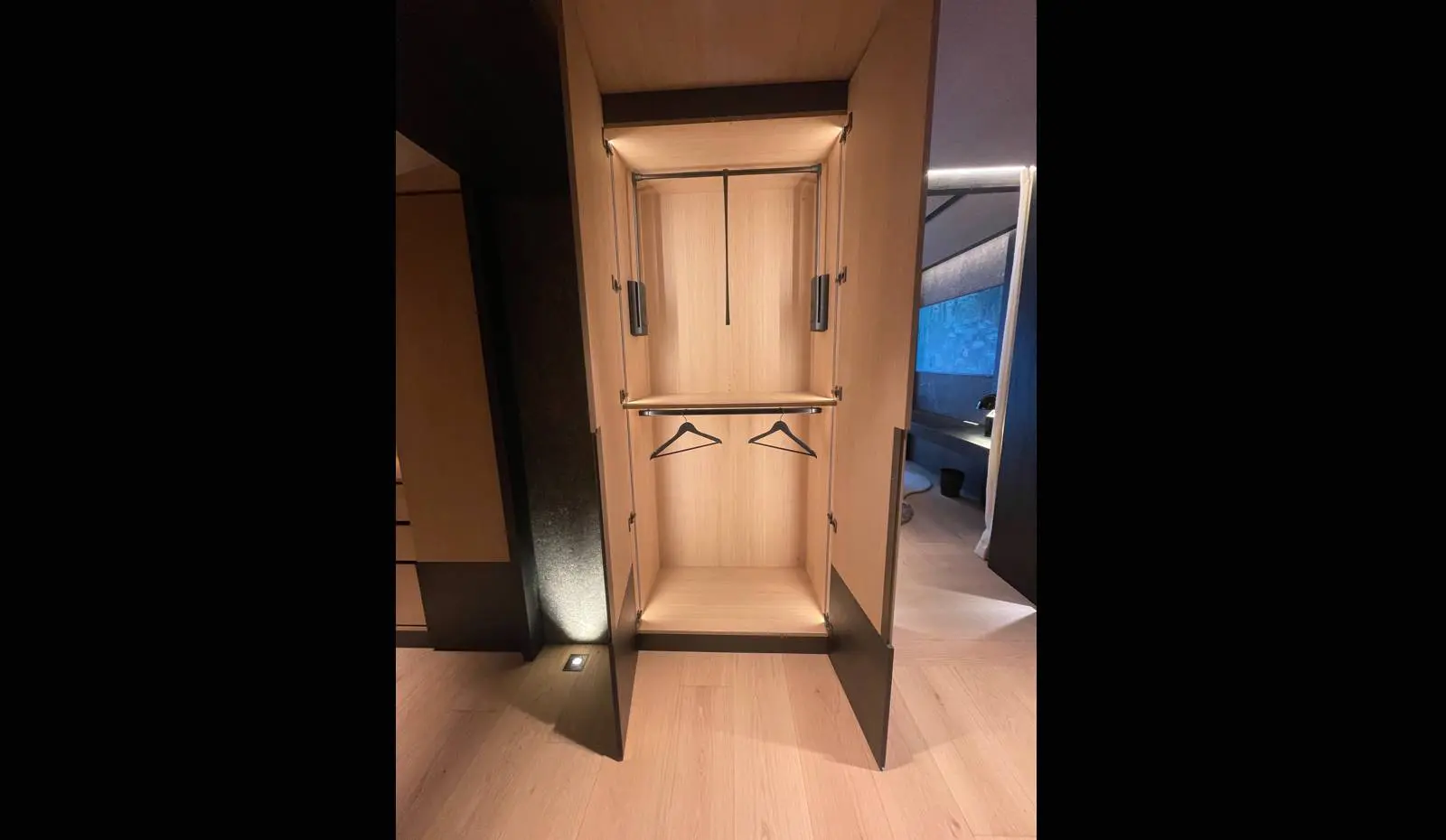 Ce dressing intègre des solutions de rangement innovantes : penderies modulables, tiroirs à fermeture douce, étagères ajustables et espaces dédiés aux accessoires. L’aménagement intérieur a été pensé pour répondre aux besoins spécifiques des propriétaires, en tenant compte de leurs habitudes et du type de vêtements à ranger.