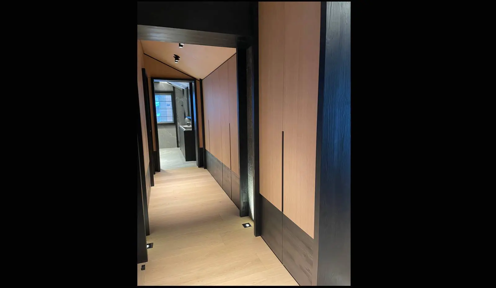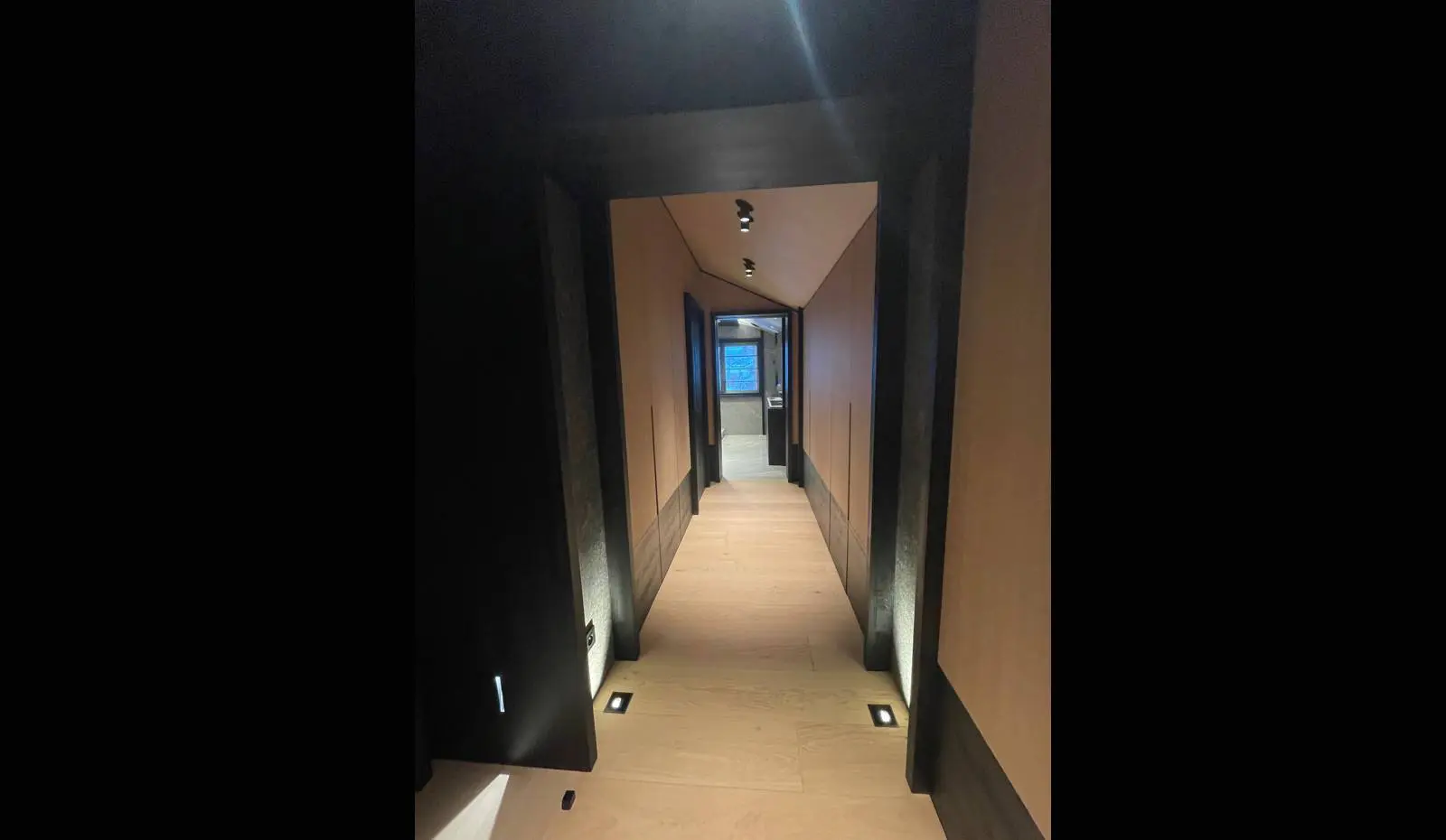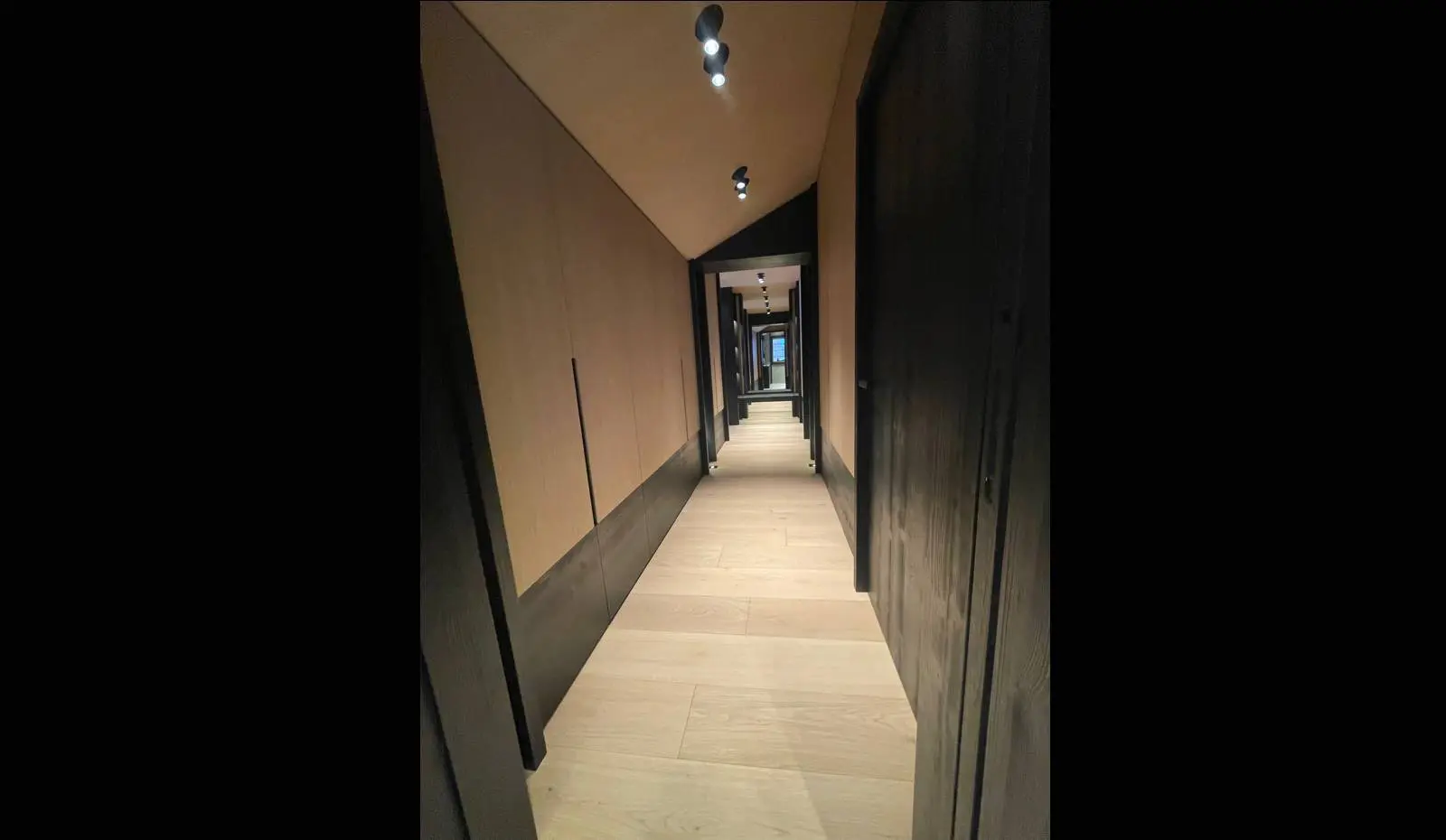 Pour ce projet à Courchevel, nous avons sélectionné des essences de bois nobles parfaitement adaptées aux conditions climatiques de montagne. Le bois utilisé présente une résistance naturelle aux variations d’humidité et conserve sa stabilité dans le temps, même face aux écarts thermiques importants caractéristiques de la haute altitude.