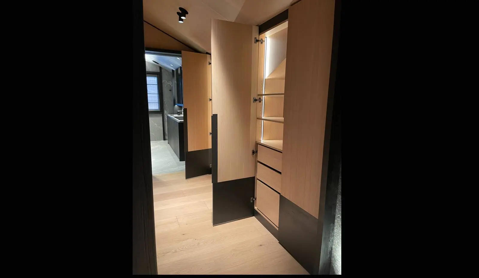 L’éclairage LED intégré valorise les finitions bois et facilite l’utilisation quotidienne, créant une ambiance chaleureuse parfaitement en accord avec l’esprit montagnard du chalet.