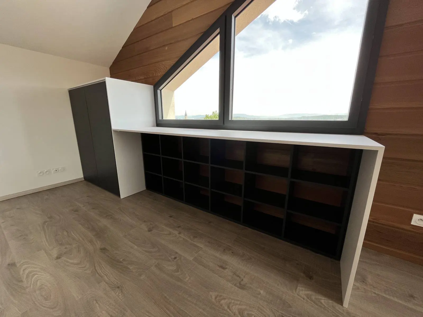 Ce projet sur mesure répond à une demande précise : créer un espace de travail et de rangement optimisé dans un volume donné. Le meuble bibliothèque conçu par nos ébénistes combine intelligemment plusieurs fonctions essentielles pour aménager un espace de vie moderne et fonctionnel.