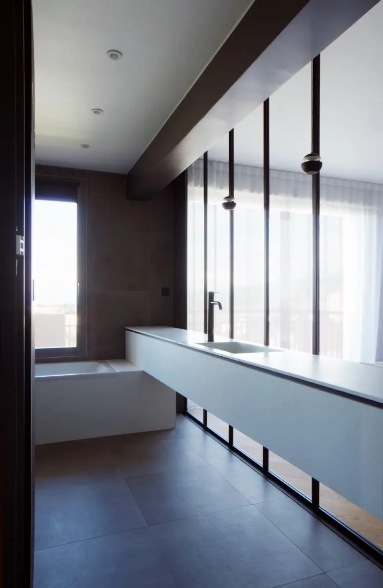 Pour ce meuble de salle de bain, nous avons choisi un plan de travail en résine Corian, un matériau prisé pour ses qualités esthétiques et sa durabilité. Le Corian offre une surface lisse et élégante, résistante aux tâches et à l’humidité, idéale pour une utilisation quotidienne dans une salle de bain. De plus, sa finition sans joint apparent crée un rendu uniforme et épuré, accentuant l’esthétique moderne de la pièce. La résine Corian est également facile à entretenir, ce qui en fait un choix judicieux pour un espace où l’hygiène est primordiale. Sa finition sobre et élégante s’accorde parfaitement avec l’aluminium de la verrière, créant une harmonie visuelle entre les différents éléments du meuble.