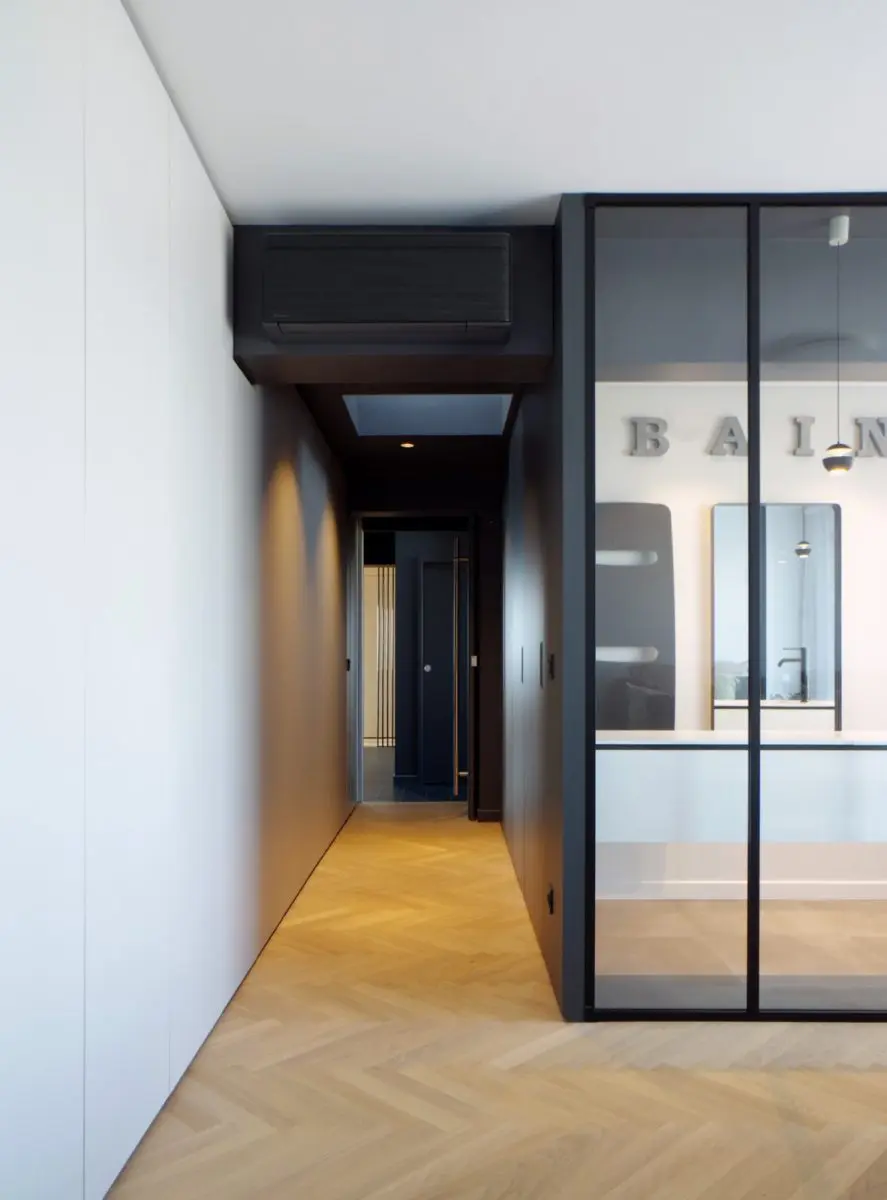 Dans cette chambre parentale, le besoin était de créer un espace salle de bain intégré, pratique et esthétique, sans compromettre la sensation d’espace. Nous avons donc conçu un meuble de salle de bain moderne qui répond à ces attentes, en intégrant de nombreux rangements pour optimiser l’espace et garder la salle de bain toujours organisée. La verrière en aluminium et verre sécurit apporte une séparation discrète entre la salle de bain et la chambre tout en laissant circuler la lumière naturelle. Ce choix de matériau confère à l’ensemble une allure moderne et industrielle, tout en assurant l’intimité nécessaire pour un espace dédié au confort et au bien-être.